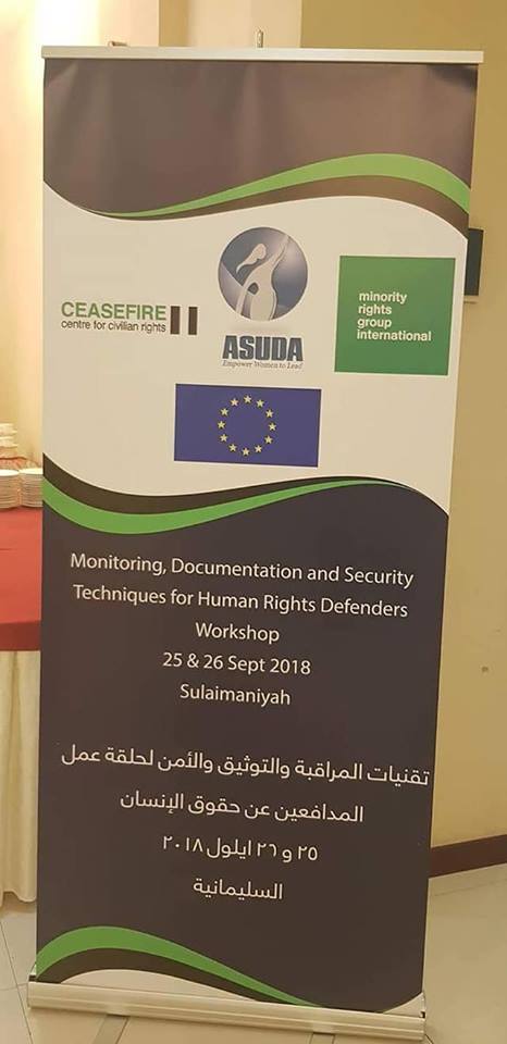عقدت منظمة Asuda و بالتعاون مع منظمة حقوق الأقليات القومية، ورشة عمل لمدة يومين (25-26 سبتمبر 2018) حول " تقنيات المراقبة والتوثيق والأمن للمدافعين عن حقوق الإنسان "، و حضر في هذة الورشة مجموعة من الناشطين والمدافعين عن منظمات الحقوق الإنسان غير الحكومية من مختلف المحافظات العراق.